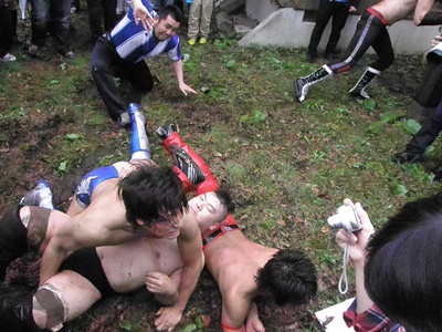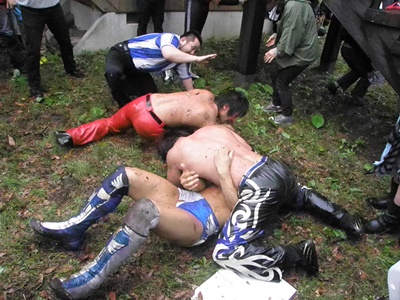 ジェネリコがHARASHIMAの背中に泥を投げつける(左写真)。