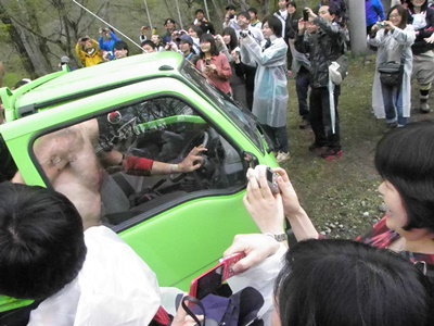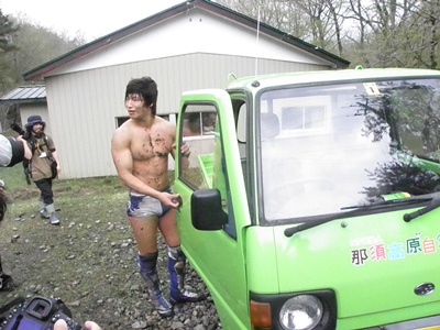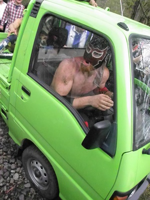 今回の会場の一番端まで来た飯伏、那須高原自然学校の軽トラックを発見、運転席に乗ろうとする(左写真)。