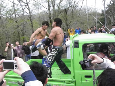 HARASHIMAは飯伏を荷台に上げる(左写真)。