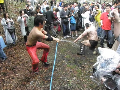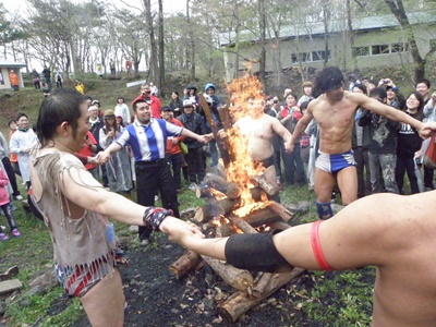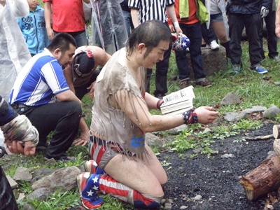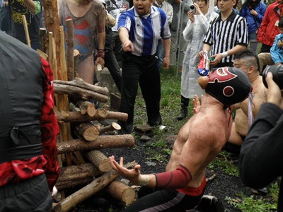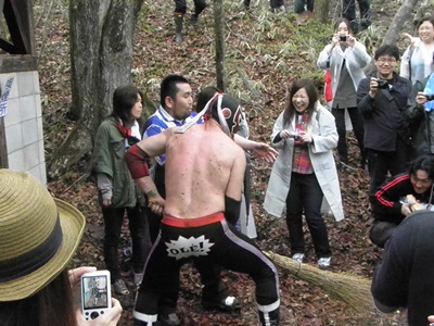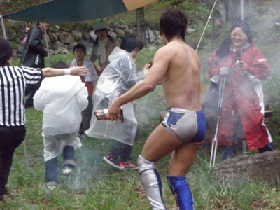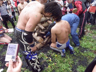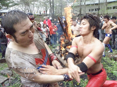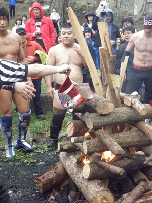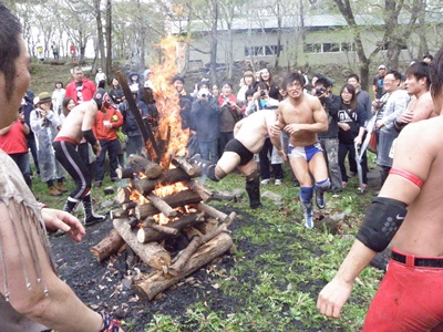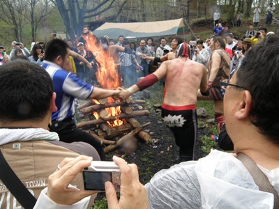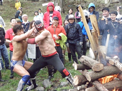 木曽レフェリーがパトリオットマスクを燃やそうとする(右写真)。レフェリーも次第に壊れつつある狂乱の自然学校プロレス。