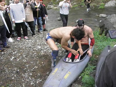 飯伏とジェネリコはカヌーを持ち上げようとしたが水の入った飯伏艇は上がらず、ジェネリコが持ち上げて飯伏にぶつける(左写真)。