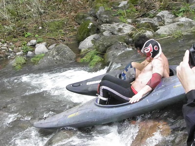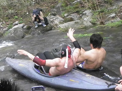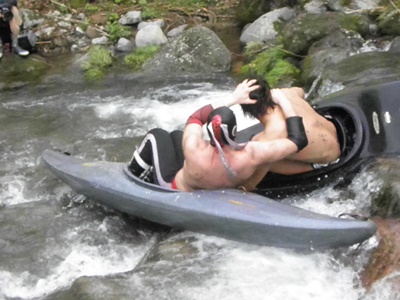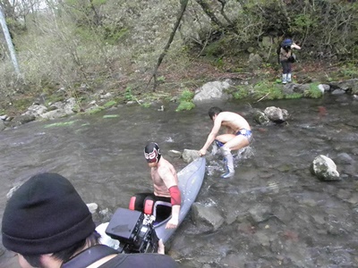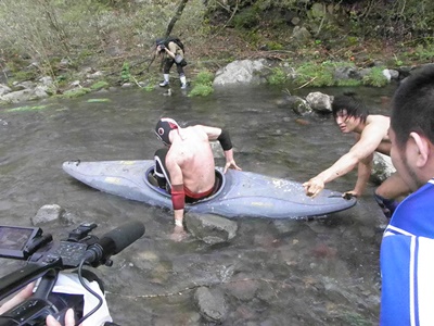 飯伏は自らももう一艘のカヌーに乗って2人で流れる(右写真)。