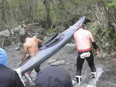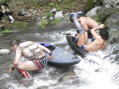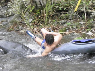 ジェネリコ先にカヌーから脱出、飯伏艇はひっくり返り浸水(左写真)。