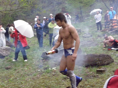 川で体の冷えた飯伏はキャンプファイヤーで暖を取ろうとするがまだ火が点いてない(左写真)。