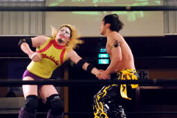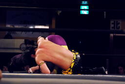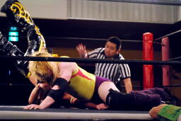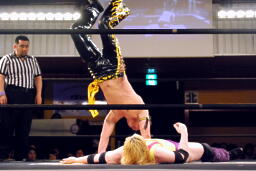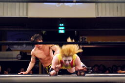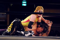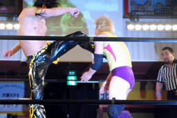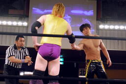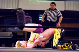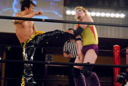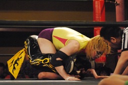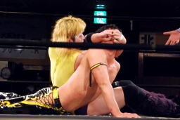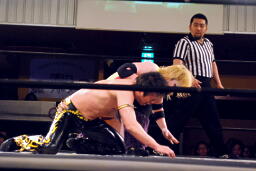 矢野はKUDOの手首を逆に曲げ、アームバーに(右写真)。KUDOエビ固め、カウント1、矢野は裏十字に。
