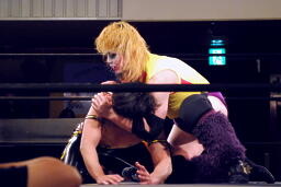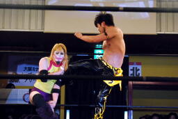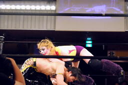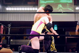 トップロープ越しにサイドネックロック(左写真)、KUDOブレーク、コーナーに上ってダイビングダブルニーアタック、矢野かわしてサイドネックロック。KUDOはコーナーに押し込んでブレーク。