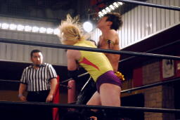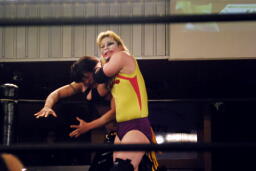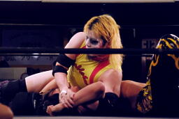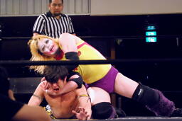 矢野組み付いてグラウンドに、変形のハーフネルソン(左写真)、リリースすると座った状態のKUDOの後頭部にボディプレス。両足ではさんで首をツイスト。