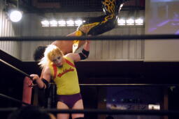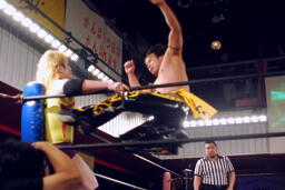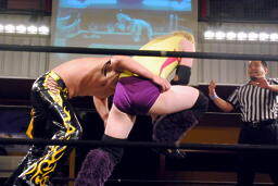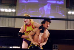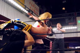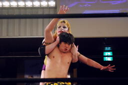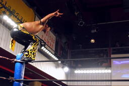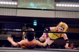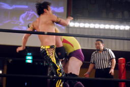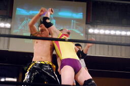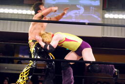 KUDOボディスラム、コーナーに上って(右写真)、