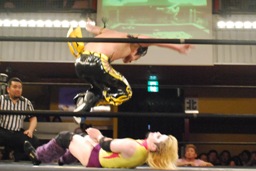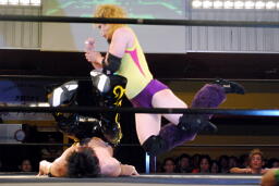 首投げから腕への倒立式ダブルニードロップ(左写真)、カバー、カウント2。
