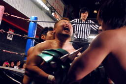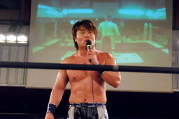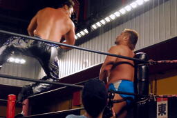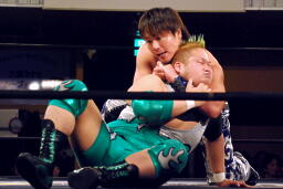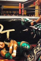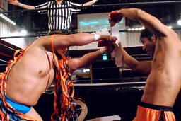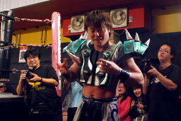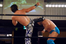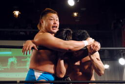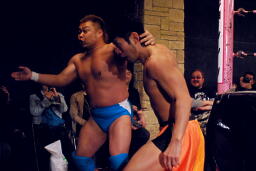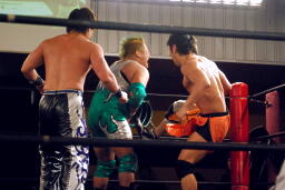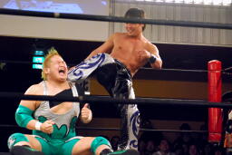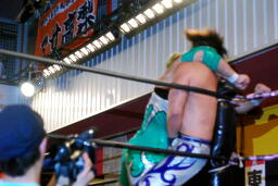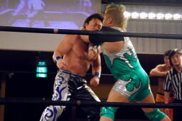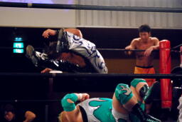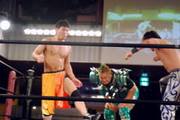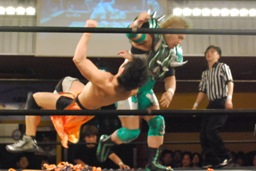 HARASHIMAと高梨は松永を場外に放り出すとまだ鎧を着けたままの入江に攻撃(右写真)。ダブルでロープに振るが入江はクローズラインをかわして2人にショルダーブロック。