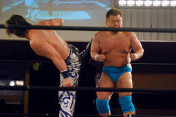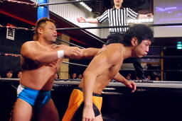 HARASHIMAエルボー、松永もエルボー。HARASHIMAハイキック(左写真)、