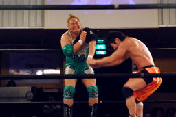 松永入ってダブルでロープに振る、HARASHIMAかわして同士討ちに。松永トミーボンバー(左写真)、カウント2。