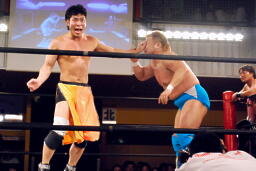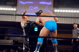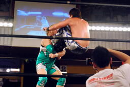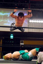 松永が高梨を肩車、入江がコーナーに上ってダブルインパクト狙うがHARASHIMAが阻止(右写真)、
