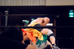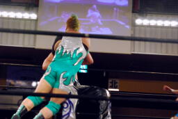 入江ブラックホールスラム、カウント2。肩に担ぐ、高梨着地してスクールボーイ(左写真)、起き上がったところにドロップキック、HARASHIMAにタッチ。