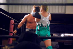エルボーの打ち合い(左写真)、HARASHIMAはミドルキック、高梨にタッチ。