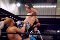 高梨コーナーに振る、入江切り返して串刺しラリアット、高梨かわしてロープに飛ぶ、それを見て入江は十字方向に走り横からのショルダーブロック(左写真)、松永にタッチ。