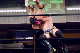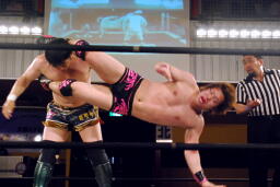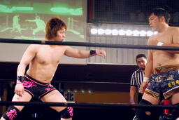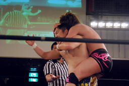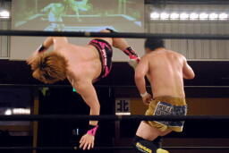 佐藤ローキック、ミドルキック連打からもう一発バックドロップ(右写真)、カウント2。