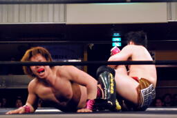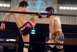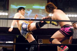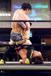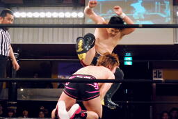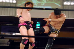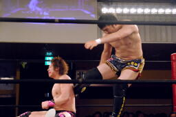 佐藤ヒザ蹴り、首投げからサッカーボールキック(右写真)、カバー、カウント2。