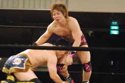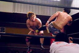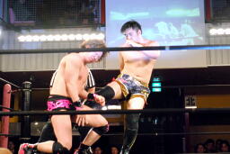 佐藤ロープに飛ぶ、石井カウンターのドロップキック(左写真)。石井ストンピング、エルボースタッブ連打。