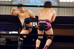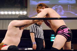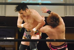佐藤切り返してヘッドロック、石井ロープに振る、佐藤ショルダーブロック(右写真)。