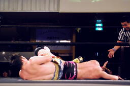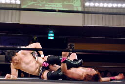 石井エルボー、佐藤ローキックで倒しスタンディングアキレス腱固めから逆片エビ(左写真)、石井ロープ。佐藤ストンピング。