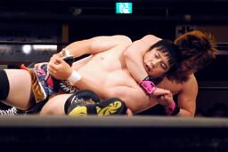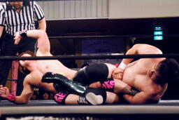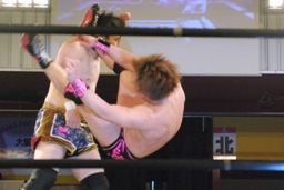石井フィッシャーマンバスターの体勢、佐藤ブロックしてワキ固めに、石井もう片方の腕でラリアット(右写真)、