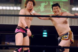 石井がロープつかむと佐藤はリリースしてバックドロップ(左写真)。