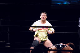 高尾はまたTシャツ着てリングに入るとマイケルを脇澤に2度ぶつける(右写真)。高木にタッチ。