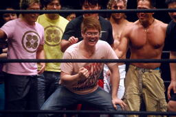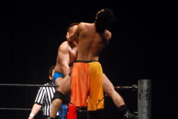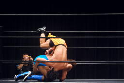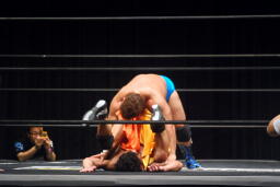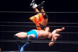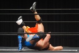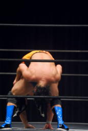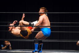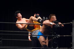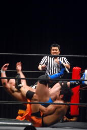 柿本のドロップキック見たのって何年ぶりだろう(左写真)。本人いわく「当たらなかった」そうだけど。柿本のテーマ曲が流れる。