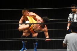 松永をコーナーに上げて自分もコーナー最上段に。松永が抵抗、高梨はヘッドバット(右写真)。