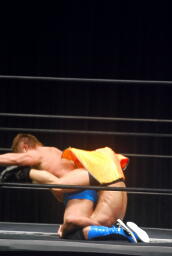 高梨着地して松永をコーナーにぶつけると背後から「マサ高梨70kg!」(左写真)