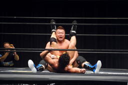 そこから背中に飛びついてエビ固め(左写真)、松永切り返して押さえ込む、エビ固めの応酬はいずれもカウント2。