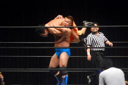 松永オースイスープレックス(右写真)、カウント2。