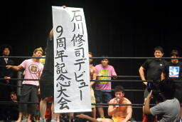 その紙には「石川修司デビュー9周年記念大会」の字が(左写真)。確かに石川は9年前の6月15日にスーパー宇宙パワー相手にデビュー戦を飾っている。