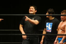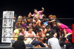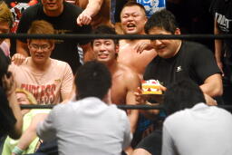 高梨「今石川はユニオン、俺はDDT、そしてカッキーは復帰に向けてトレーニング中ということでみんな道は違うけど、今日石川のおかげで集まれたことを嬉しく思います。今日は嘘になっちゃったけど、俺はもう一度あのポスターを現実にする。もう一度あのベルトを巻いて、石川、お前とタイトルマッチで対峙してやるから、お互い、カッキーも含めて頑張ろう。」