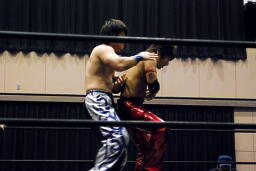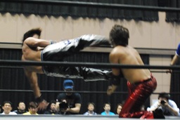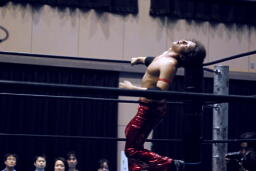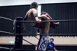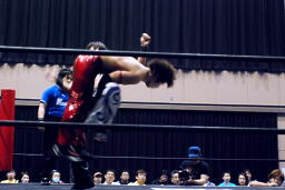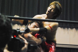 高尾コーナーに上ってミサイルキック(左写真)、カウント2。