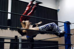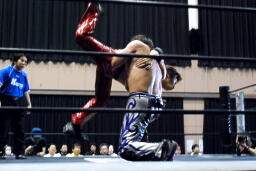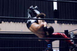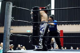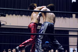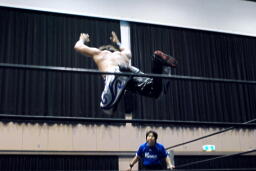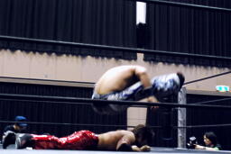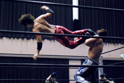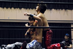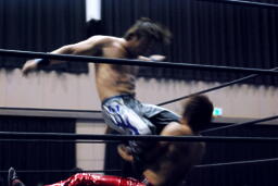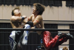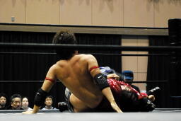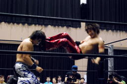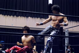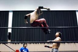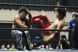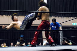 高尾ロープに振る、HARASHIMAショルダーブロック(右写真)。HARASHIMAロープに飛ぶ、高尾リープフロッグからドロップキック、HARASHIMAスカす。HARASHIMAロープに飛ぶ、高尾前転からドロップキック。