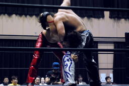 HARASHIMA切り返してヘッドロックからフライングメイヤー、高尾ヘッドシザーズ(右写真)。HARASHIMAはネックスプリングで脱出。