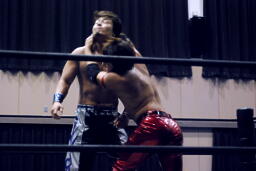 エルボー打ち合いから高尾がランニングエルボー(左写真)、HARASHIMA左のラリアット。