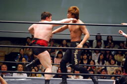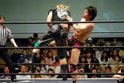 矢野ロープに飛ぶ、遠藤リープフロッグでかわしてドロップキック(左写真)。手四つと見せかけて矢野サミング、ロープで顔面こすり、ウラノにタッチ。