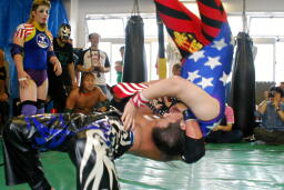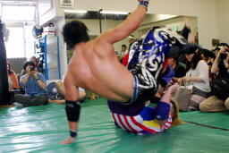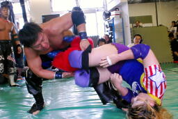 ばってん首投げからサッカーボールキック、回転ネックブリーカー(左写真)。KEITAにタッチ。