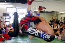 ガードを飛び越えてギロチンドロップ(左写真)。