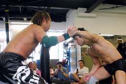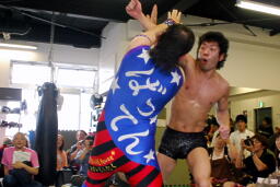 佐野スライディングラリアット、カウント3入ったようにも見えたがレフェリーは2だとして試合は続行。うーん。チョップの打ち合い(左写真)。