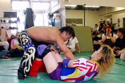 佐野フロントネックロック(右写真)、高梨ロープ。高梨トラースキック、伊橋にタッチ。