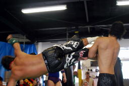 首相撲からヒザ蹴り(左写真)。