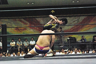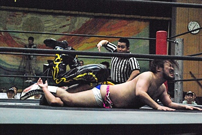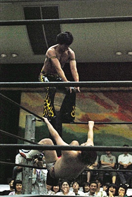 顔面をターンバックルに叩きつける恐るべき新技(左写真)、片エビ固めでカウント3。