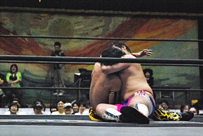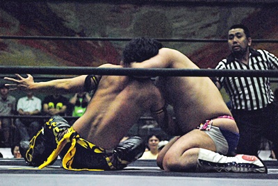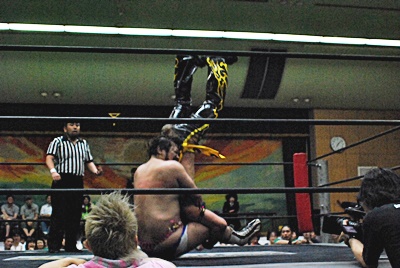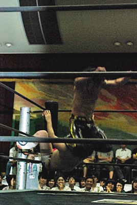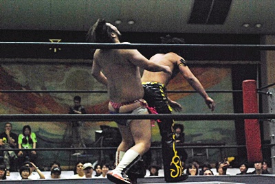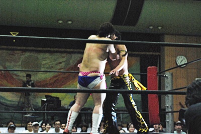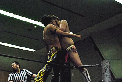 ディーノは男色トルネードのサインを示して再度コーナーに、KUDO後ろから捕まえる(右写真)。