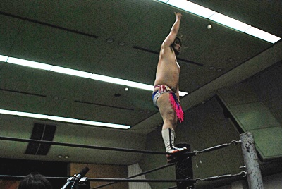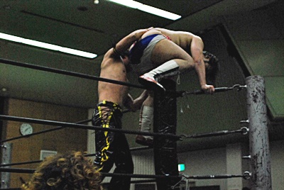 KUDOボディスラム、コーナーに上る、ディーノも上る、KUDOエルボー(左写真)。