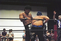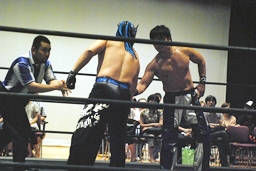 HARASHIMA突っ込む、アズールロープを引き下げてHARASHIMAを場外に落とす(左写真)。