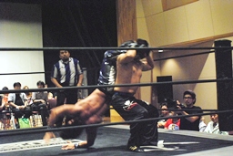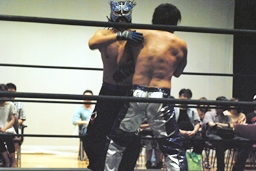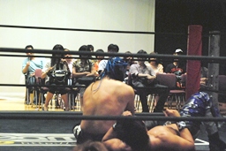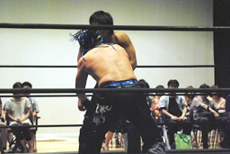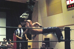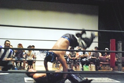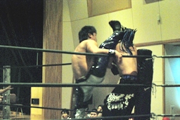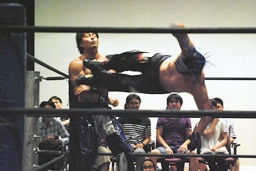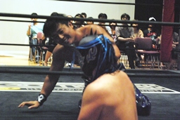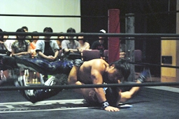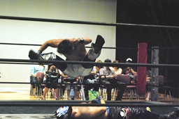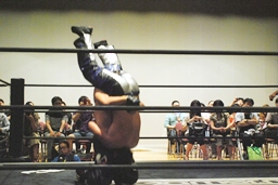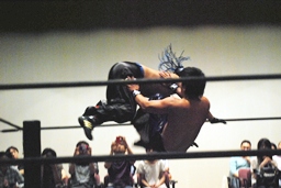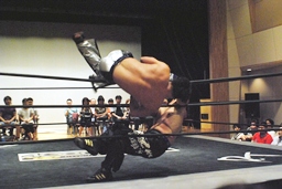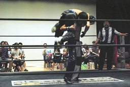 アズールコーナーに上ってダイビングボディアタック、HARASHIMAはそれを山折りに切り返す(右写真)。